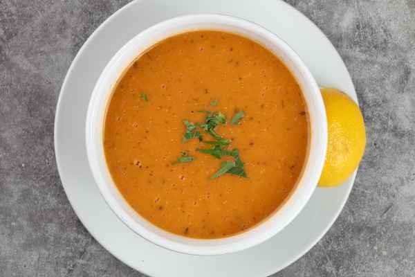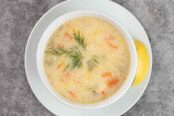 Hearty chicken soup with carrots, potato, onion, green and red pepper and dill, with cream base.