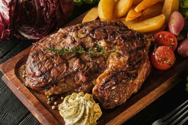 14oz Premium Steak seasoned and grilled served with asparagus and mashed potato.