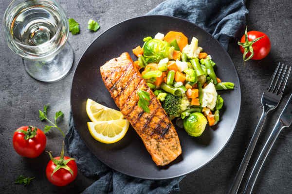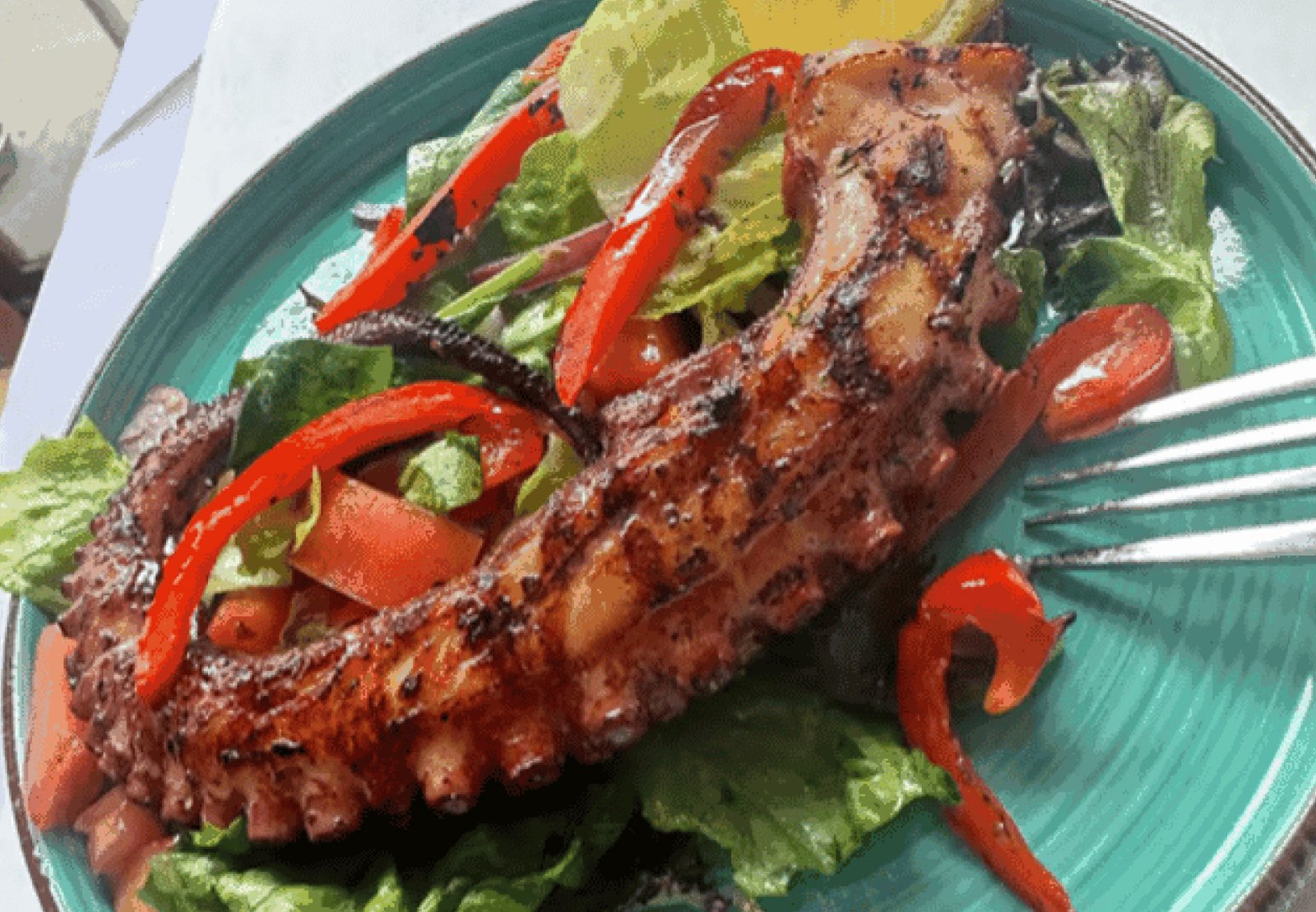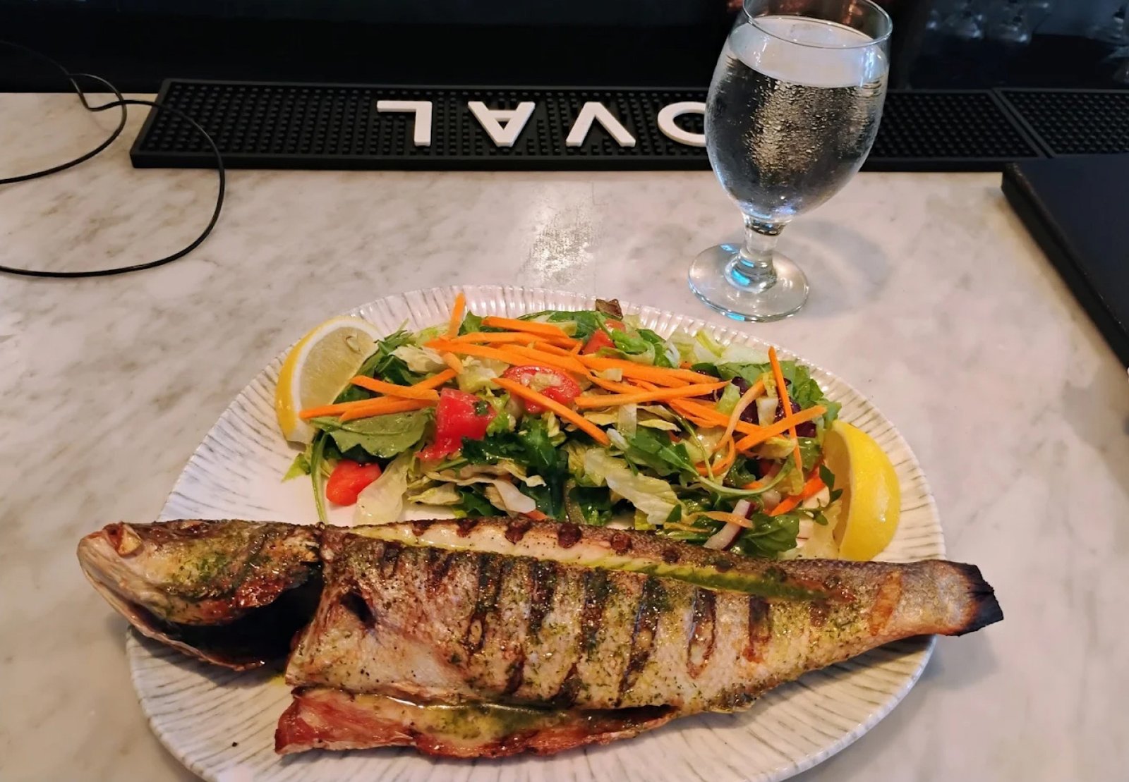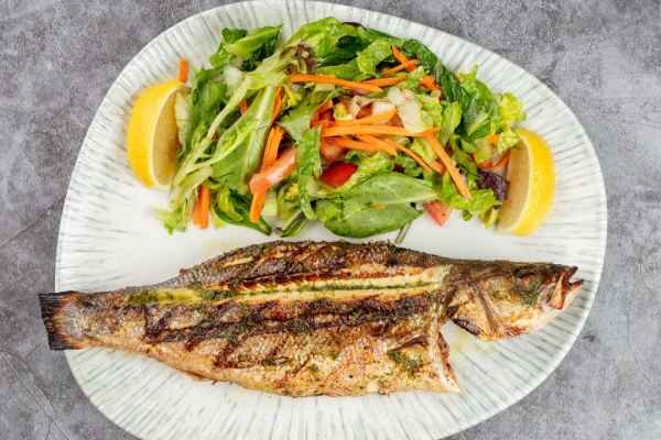 Whole Fresh Mediterranean Branzino, grilled and served with mixed salad.